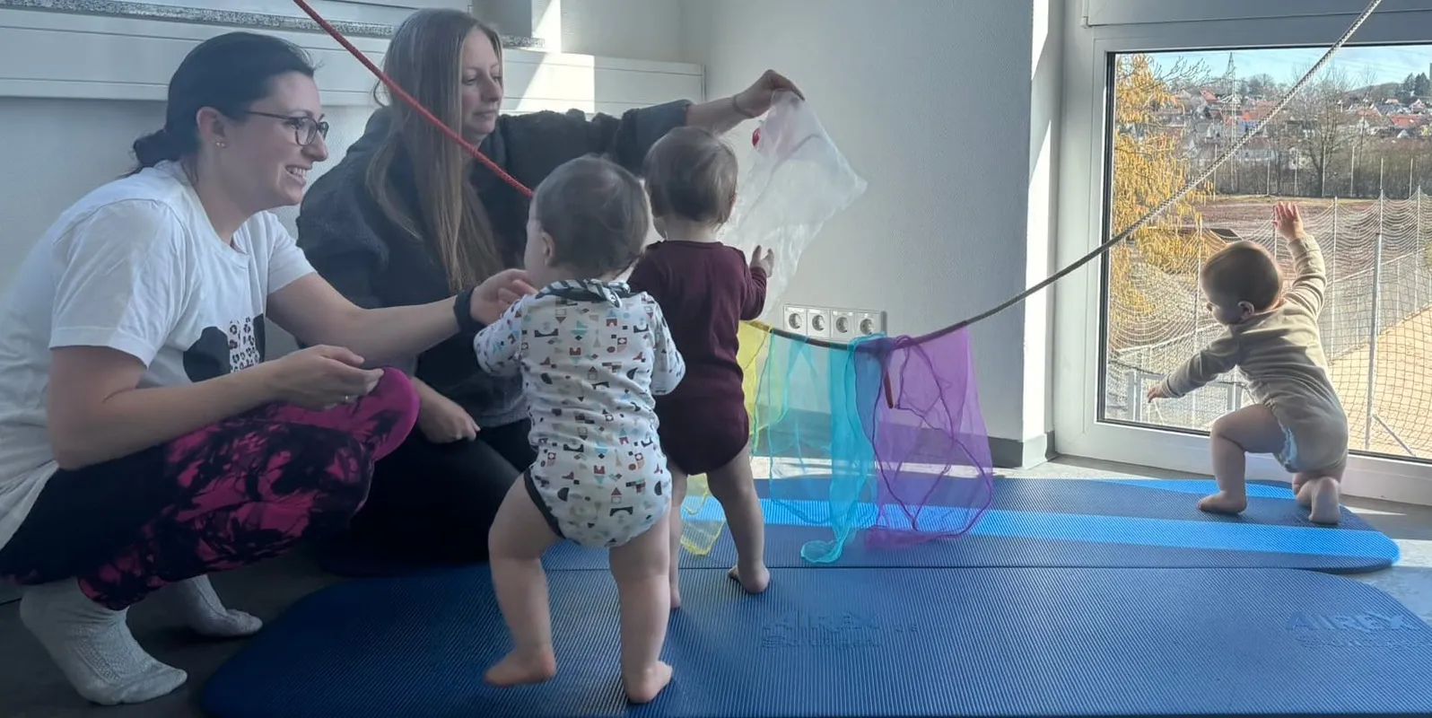 Die Inhalte orientieren sich an den jeweiligen Entwicklungsphasen der Kinder. Teresa Wildman: „Die Übungen reichen vom ersten Greifen und Fühlen über die Bauchlage und das Drehen bis hin zu Krabbeln, Stehen und Laufen.“ Ergänzt wird das Angebot durch Finger- und Bewegungsspiele sowie freie Spielphasen. Damit setzt der Verein auf eine Mischung aus angeleiteten Übungen und offenen Elementen, in denen die Babys selbst aktiv werden können.